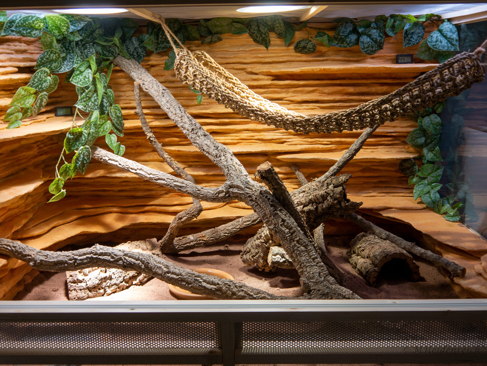 Etwas schwieriger als den Deckel mit Lüftungsflächen und die Abtrennung zur Technik ist die Front zu bauen. Eigentlich sieht die Rahmenkonstruktion ganz einfach machbar aus, aber einige Punkte müssen doch bedacht werden: Für Belüftungsgitter und untere Sichtscheiben1Wer hier nicht auf 10 bis 15 cm hohen Sand-Lehm-Boden schauen möchte, kann natürlich anstelle von Glaselementen hier eine Holzblende verwenden. Enstprechend muss dann die Rahmenkonstruktion angepasst werden. müssen einige Millimeter in die Holzleisten gefräst werden, so dass sie später sicher und fest in der Rahmenkonstruktion sitzen. Auch die Führungsschienen für die Glasschiebetüren brauchen – sofern man nicht ein Alu-Schienen-System2Wir haben bei zwei Terrarien dieses Rollschiebetürensystem verwendet benutzt – entsprechende Nuten. Erst dann baut man den Außenrahmen zusammen, setzt die unteren Glasscheiben, Lüftungsgitter und Zwischenstreben ein. Den so fertiggestellten Rahmen haben wir dann im Terrarium verleimt. Eine andere Methode (wie bei den OSB-Selbstaufbau-Set) ist das Verschrauben mit Boden, Seitenwänden und Deckel (bzw. Technikabtrennung). Nun noch die Führungsschienen in die Nuten einkleben (oder das Schienensystem entsprechend der Beschreibung anbringen), Glasschiebetüren einsetzen – und voilá: Das Terrarium ist bereit für das Einrichten mit Sand-Lehm-Boden und Dekorationen:
