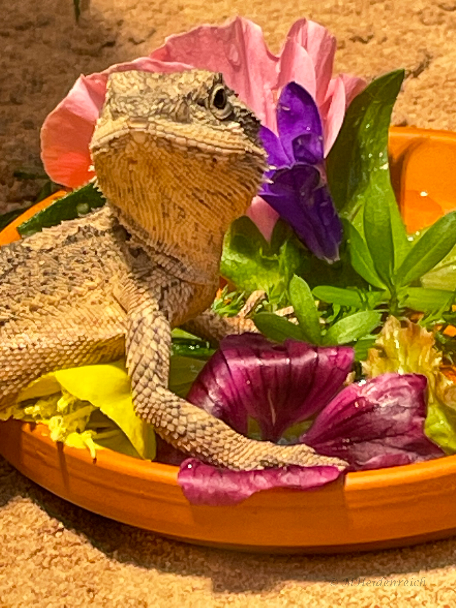 Bei der Auswahl der pflanzlichen Nahrung können die kleinen Drachen sehr wählerisch sein, wenn es ihnen angeboten wird: Was an einem Tag noch genießbar war, wird am nächsten Tag verschmäht. Oder das gesamte „Grünzeug“ wird nur skeptisch beäugt und danach komplett ignoriert. Von unseren anderen Bartagamen gewöhnt, dass sofort jemand neben oder sogar in der Futterschale sitzt, war das anfangs schon etwas frustrierend. Mittlerweile bin ich dann doch eher erfreut, wenn zumindest ein Drache etwas vom Grünzeugs probiert. So gibt es hier jeden Tag für die Minor-Bande einen neuen, bunten „Salatteller“ – mal mit frischen, mal mit getrockneten Pflanzenteilen oder auch mal gemischt. Wenn ich jetzt nur das auflisten würde, was hier immer als „essbar“ eingestuft wird, dann bleibt die Liste sehr überschaubar: